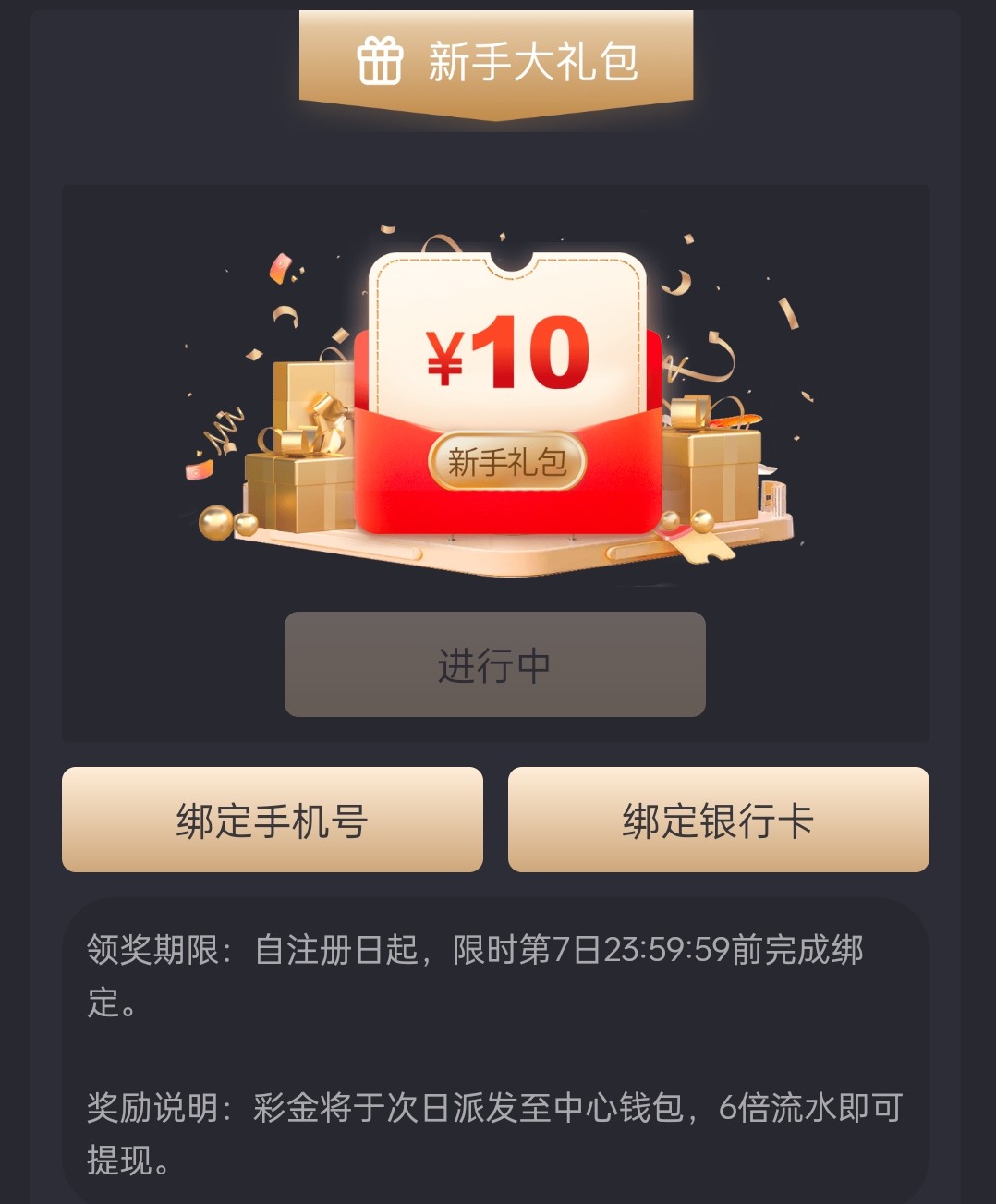 新用户注册绑卡 完善信息 优惠里面找到新手攻略活动 自助领取10领取到6倍水提现 审核很慢要隔天才到